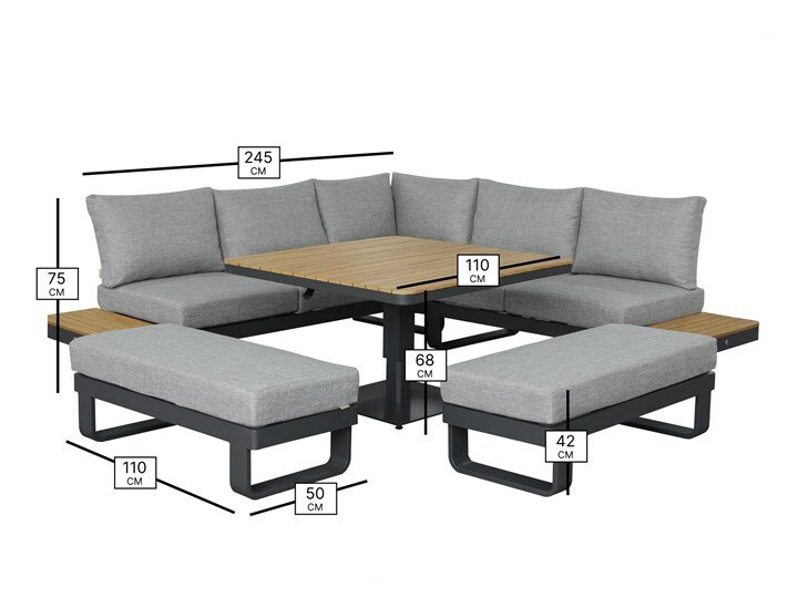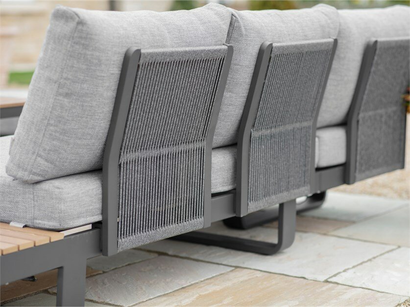 Ideal for relaxed garden living, the Brooklyn Square Sofa with Square Tree-Free Piston Table & 2 Benches combines modern, industrial-inspired style with practical comfort. The square sofa and two cushioned benches feature rope-back detailing and wood-effect accents, while deep, season-proof Shadow cushions provide an indoor-level comfort to the outdoors. The square tree-free piston table offers versatile height and functionality, making this set perfect for relaxing, entertaining, or casual dining. Crafted in powder-coated anthracite aluminium, Brooklyn blends durability with stylish design for contemporary outdoor spaces.