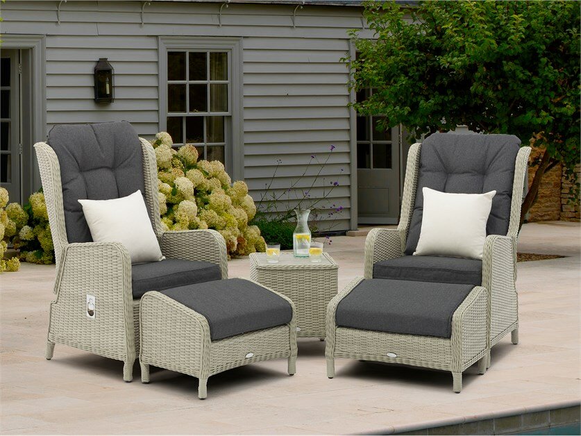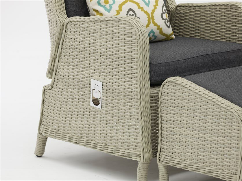 A pleasing blend of traditional design with added detail for exceptional style and elegance, the generously proportioned recliners are lightweight and blissfully comfortable. The all-weather Dove Grey rattan is built on an aluminium frame, hence the furniture is strong and rust-free. Soft-touch, Herringbone Dusk cushions are made from our quality season-proof fabric which is water, stain and frost-resistant.