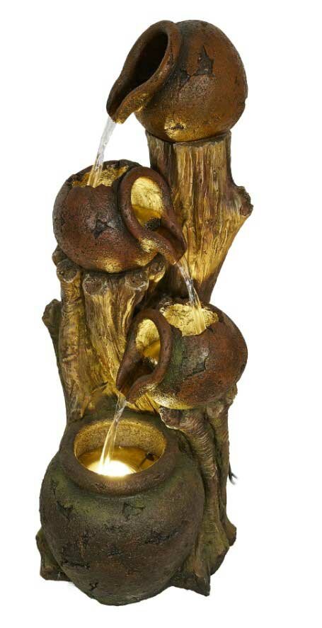 The Marlborough Woodland Pots water feature combines natural textures with a classic design. Water flows between stacked pots atop tree-trunk-like pillars, creating a rustic yet structured cascade.