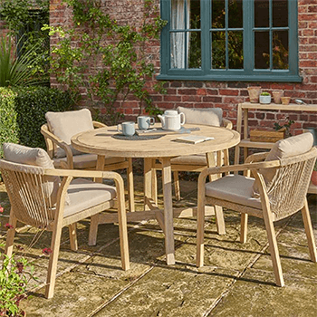 Made from FSC certified Acacia wood with durable rope detailing on the back and sides, this sturdy set is comfortable as well as stylish. Comprising of a large table and 4 comfortable seats, there's plenty of space to relax or dine with family and friends.