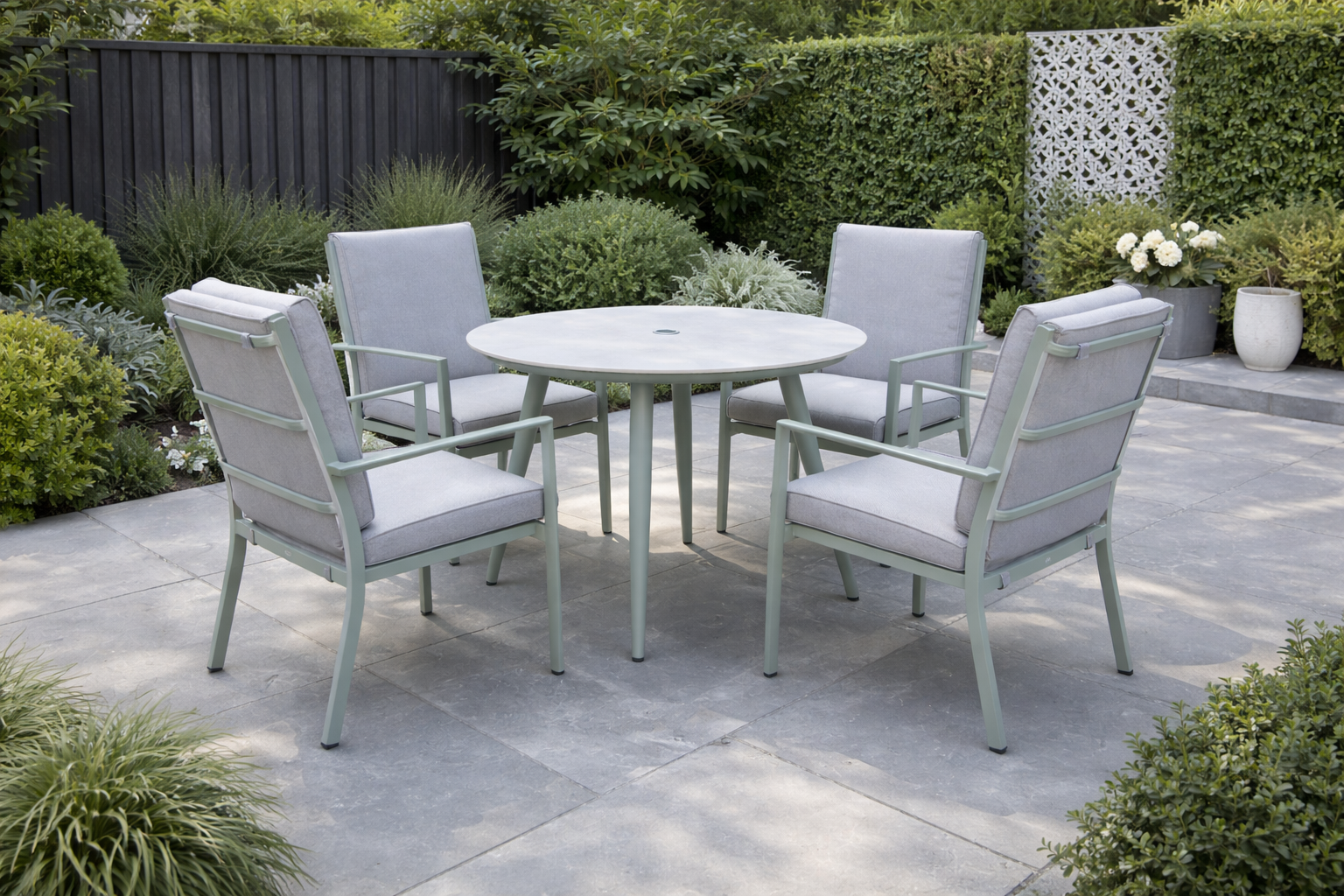 - Deep, comfortable light grey cushions for relaxed outdoor living