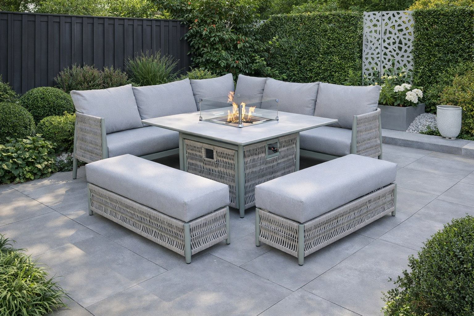 Create a luxurious outdoor focal point with the Loom Oasis Corner Firepit Set, designed for stylish entertaining and year-round outdoor relaxation.The Loom Oasis garden furniture range is designed to create a calm, contemporary outdoor retreat, combining refined colour tones with exceptional comfort and durability. With its soothing palette and thoughtfully engineered materials, Oasis is perfect for modern gardens, patios, and outdoor entertaining spaces.