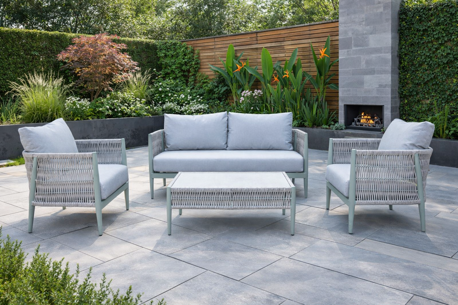 Featuring a muted sage aluminium frame, the collection brings a subtle, natural elegance that complements both greenery and stone settings. This is beautifully paired with a mottled stone synthetic rope weave, adding texture and visual interest while remaining highly durable and UV stable.