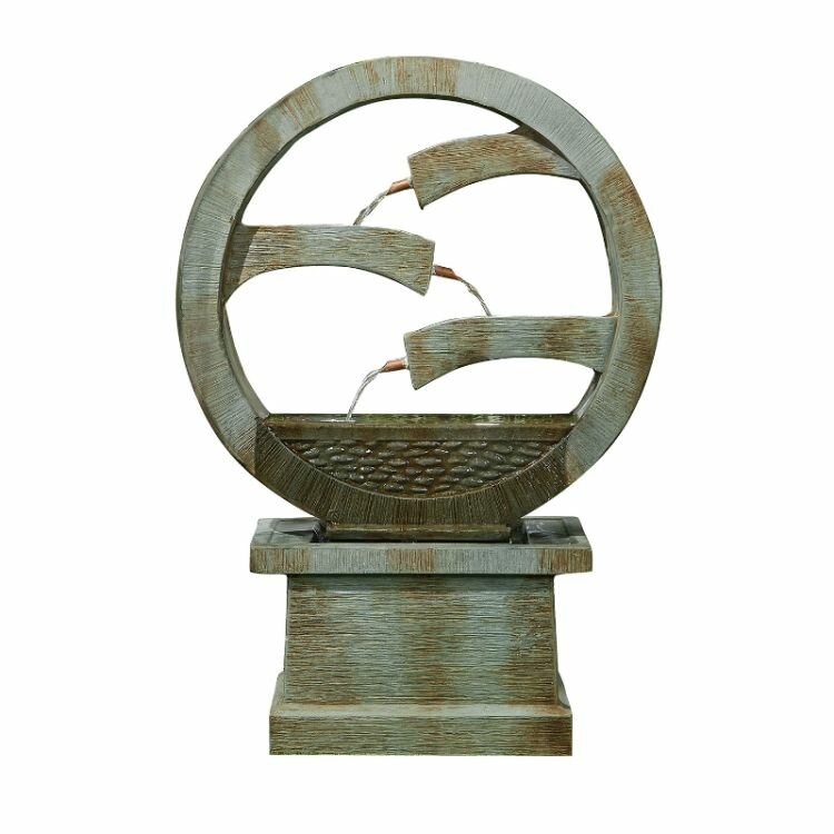Sitting on a plinth, the cleverly designed contemporary fountain consists of a circular device with internal arms through which water flows. Upon collection at the fountain’s base, the water within this self-contained feature begins its journey again.